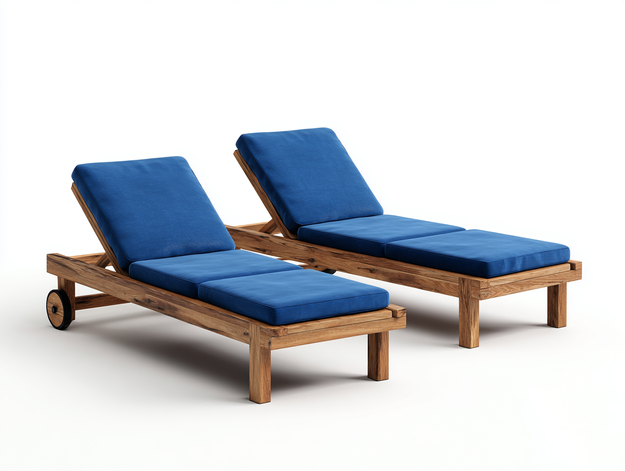 Struttura portante realizzata in legno idoneo all'uso esterno. Superficie di appoggio dotata di imbottiture rivestite in tessuto outdoor di colore blu adatto all'esposizione in ambienti esterni.
