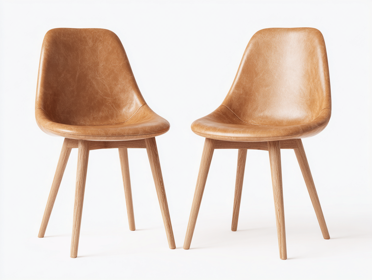 Struttura realizzata in legno con finitura naturale. Seduta e schienale imbottiti rivestiti in pelle sintetica di colore marrone cuoio, progettati per resistere all'uso quotidiano e facilitare la manutenzione. Finiture uniformi e assemblaggio preciso.